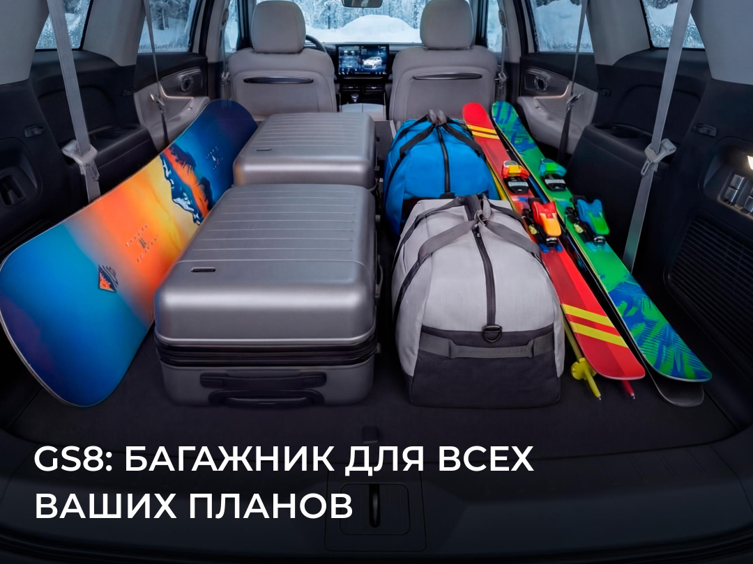 Зимний выходной — прекрасная возможность для прогулок, активных игр на морозе и уютных перерывов с горячим чаем из термоса. С вместительным кроссовером GAC GS8 вам не придётся жертвовать вещами ради поездки: вы сможете взять с собой всё необходимое.