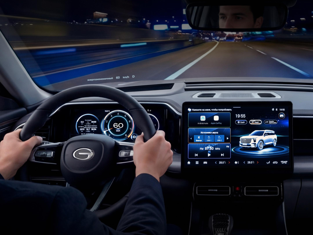 В кроссовере GAC GS8 эту задачу упрощает проекционный дисплей: он выводит ключевые данные прямо на лобовое стекло. Благодаря этому водителю не приходится переводить взгляд с дороги на приборную панель.